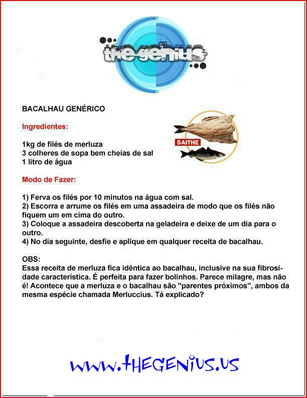 Ingredientes: 1 kg de bacalhau cozido e desfiado, 1 kg de batatas cozidas em rodelas, 2 pimentões vermelhos em rodelas, 2 pimentões verdes em rodelas, 2 cebolas grandes em rodelas, 2 tomates em rodelas, 100 g de azeitonas pretas, 6 ovos cozidos em rodelas, orégano, salsinha picada e azeite à vontade. Preparo: Untar um refratário médio com azeite e fazer as camadas: batatas, salsa, bacalhau, pimentões, tomates, salsa, orégano, sal, cebolas, azeitonas sem caroços, ovos cozidos, sal, salsa e orégano. Obs: Reservar ovos cozidos para decorar depois que retirar do forno (para não ressecar). Repetir todo o processo e por cima decorar com salsa, azeitonas, pimentão, tomate, cebola, orégano e regar com bastante azeite. Levar ao forno médio por 20 minutos. |