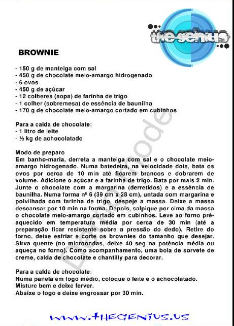 Ingredientes: Massa: 4 ovos, 2 xícaras (chá) de açucar, 2 xícaras (chá) de farinha de trigo, 1 colher (sopa) de fermento em pó. Creme: 2 colheres (sopa) maisena, 4 xícaras (chá) de leite, ½ xícara (chá) de chocolate em pó, 4 colheres (sopa) de açúcar e 2 pacotes de coco ralado (200 grs). Massa: Na batedeira, bata as gemas com oito colheres (sopa) de água até ficar esbranquiçado. Junte o açúcar e deixe bater. Retire da batedeira, misture a farinha de trigo e reserve. Bata as claras em neve e incorpore delicadamente à massa reservada. Acrescente o fermento em pó e despeje em uma assadeira retangular (23 x 32cm) untada e enfarinhada e leve para assar por cerca de 30 minutos. Depois de frio, corte em pedaços e reserve. Creme: Em uma panela, misture a maisena com um pouco de leite para dissolver. Despeje o leite restante, o Chocolate em Pó e o açúcar e leve ao fogo, mexendo sempre até formar um creme. Passe os pedaços de bolo pelo creme frio e, em seguida, cubra com o coco ralado. Embrulhe em papel de alumínio e leve para gelar. DICAS:Substitua a água do bolo por leite. Congelamento: Para congelar, junte meia lata de Creme de Leite ao creme. Deixe em freezer por até 3 meses. |